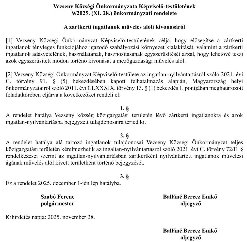 Vezseny Községi Önkormányzat 2025. évben a Területfejlesztési Alapba a Versenyképes Járások Programból kapott támogatást meghaladó összegű befizetést teljesített. Ezért Magyarország Kormánya - a közigazgatási és területfejlesztési miniszter, mint támogató útján - a Területfejlesztési Alapba történő befizetése 4 018 371 forint összegű részét számára támogatásként visszatérítette.